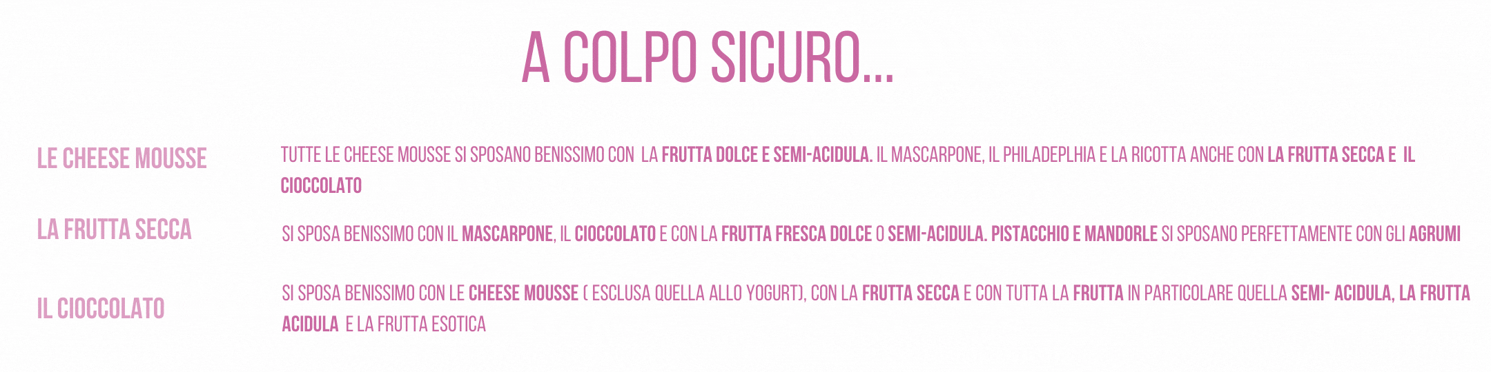 Ho preparato per te questa tabella riassuntiva dove troverai i connubi ideali tra gli ingredienti per andare a colpo sicuro! Buon lavoro!