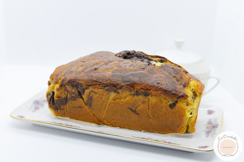 Nella variante marmorizzata al cacao, senza burro. Se desiderate realizzare la versione classica vi basterà eliminare il cacao in polvere dalla ricetta senza modificare altro.