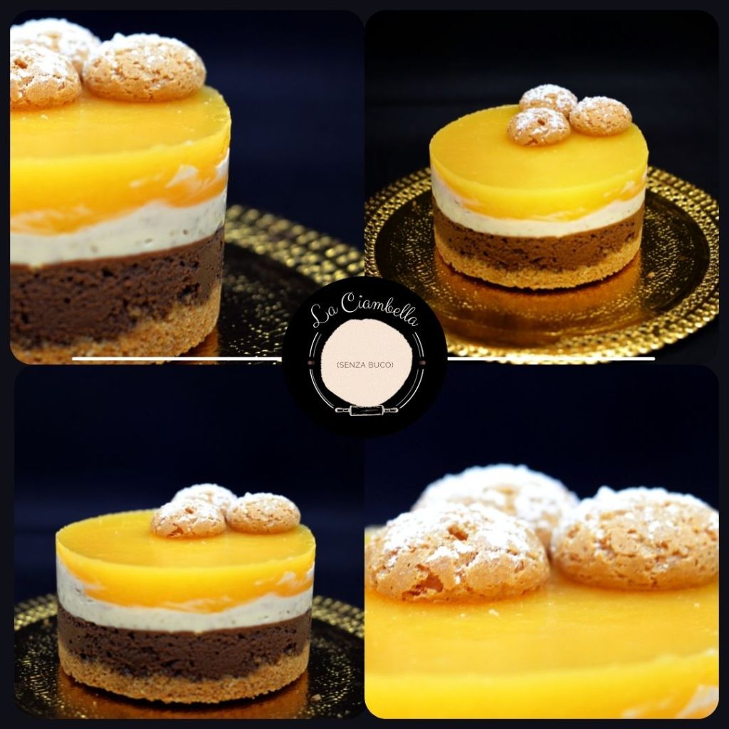 Il primo strato è una mousse al cioccolato fondente, a seguire una cheese mousse con mascarpone e noci e infine una gelée alle pesche.