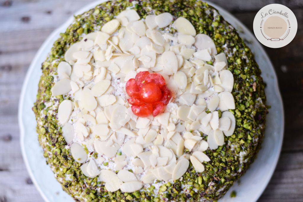 Un morbidissimo Pan di Spagna, bagnato con succo di arancia, farcito con una deliziosa crema di ricotta di pecora, scaglie di cioccolato fondente e pistacchi, decorato con granella di pistacchi ai lati e lamelle di mandorle in superficie…una bontà assoluta!!