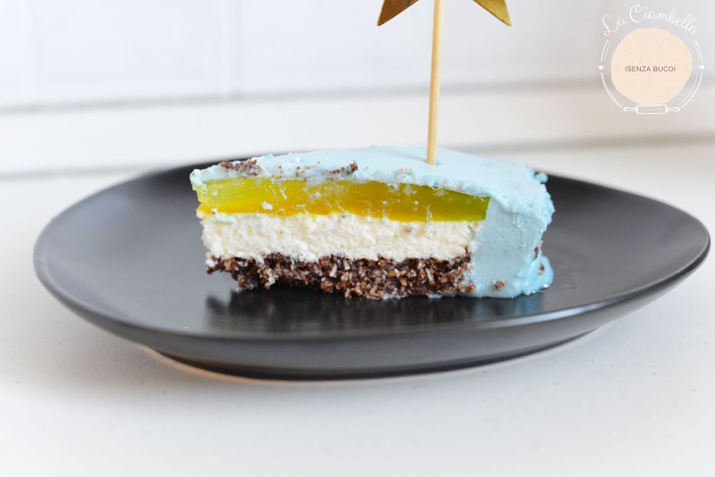 Una spumosissima mousse al cioccolato bianco colorata di azzurro, per richiamare il cielo, nasconde tre golosi strati che sanno d’estate: una base di biscotti ai cereali e cacao, una mousse esotica al cocco e una gelèe al limone e curcuma. Qui la dolcezza del cioccolato e del cocco si sposano a meraviglia con l’acidità del limone e l’amaro del cacao, mentre la curcuma regala quella leggerissima punta speziata che rende la torta speciale.