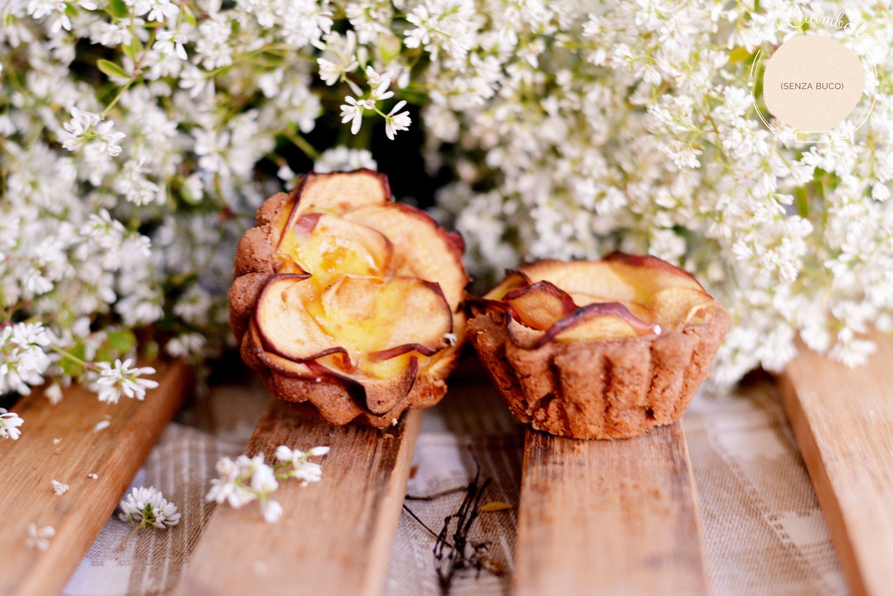 CROSTATINE AL CACAO CON CREMA PASTICCERA ALLA PESCA E ROSELLINE DI MELE