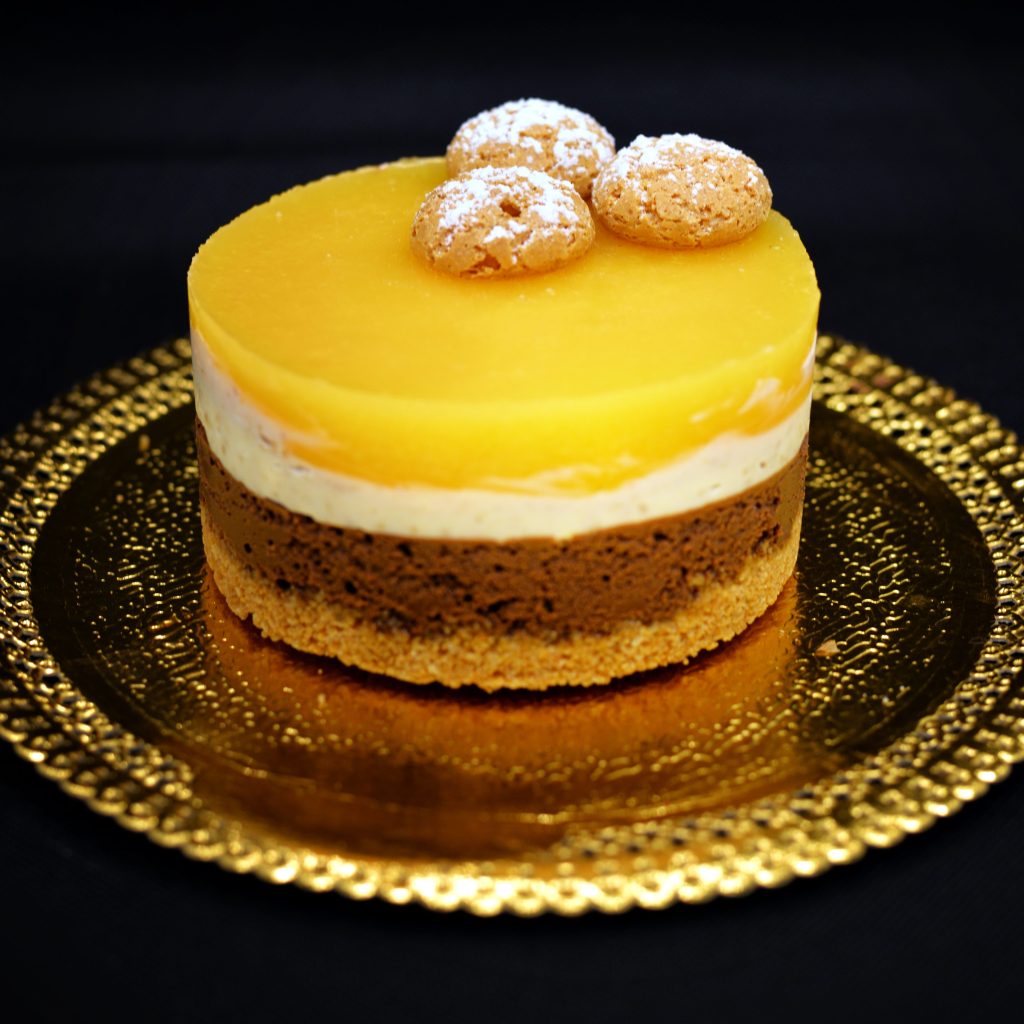 Adagia sulla base scelta tre strati a piacimento tra mousse, cheese mousse, e gelée. Il connubio ideale è tra uno strato di mousse al cioccolato o cheese mousse, uno strato di mousse alla frutta o alla frutta secca e uno strato di gelée alla frutta. Se desideri puoi aggiungere tra gli strati morbidi degli strati composti da altre basi.