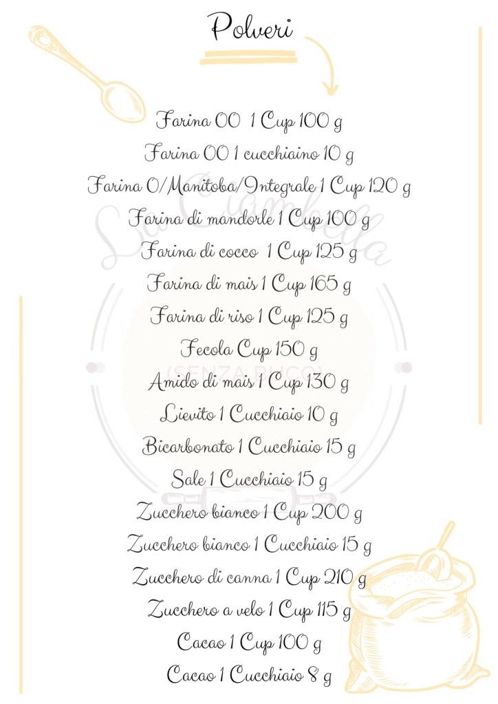 Può sempre tornare utile sapere quante tazze di un ingrediente specifico servono per realizzare il nostro dolce, per alcuni ingredienti è ancora più comodo ricorrere all’unità di misura di un cucchiaio. Ecco la tabella di conversione degli ingredienti più usati in pasticceria.